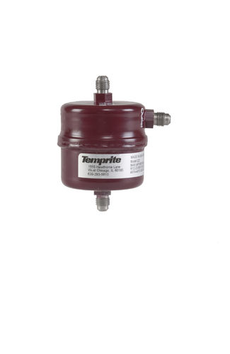 Temprite’s 300 Series of hermetic coalescent oil separators have the advantage of being one of the smallest oil separators available for their capacity. Originally designed for refrigerant recovery/reclaim systems, 300 Series units are often used in the scientific field for ultra-low critical temperature ranges. 320 and 340 Series units are 99.995% efficient in removing particulates between 0.3 and 0.6 microns (μm) and separating oil from the mass flow. The elimination of the float ball and internal oil reservoir maximizes efficiency by minimizing oil carryover. Metering the oil return back to the compressor may be done by a variety of methods including a capillary tube, a metered orifice or a timed solenoid.