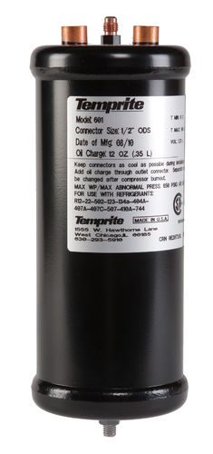 Temprite 600 Series Conventional Oil Separators are impingement screen separators. In these units, the compressed mass flow enters a larger separator chamber, lowering the velocity of the mass. Atomized oil droplets collect on the impingement screen surface; as the oil drops become larger they fall to the bottom of the separator. The 600 Series is designed for the OEM who needs oil separation but does not require the accessibility of the 500 Series.